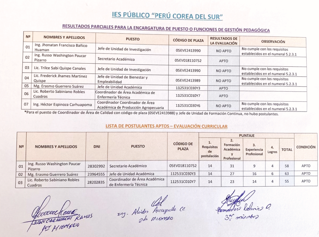Resultados finales sobre la convocatoria para encargatura de puestos de gestión pedagógica en el IESTP «PERÚ COREA DEL SUR» …